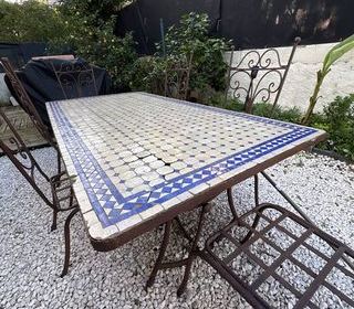 Vend table en faïence longueur 200 par 100 cm en largeur, quelques carreaux sont à remettre en place . Le plateau pèse 100 kilos il ya la possibilité d'acheter 6 chaises en fer for