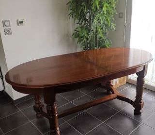 Très belle table en bois massif 180 x 90 cm + rallonge 40 cm. Possibilité d'acquérir en plus 4 chaises. Table seule 110 euros. 4 Chaises 30 euros