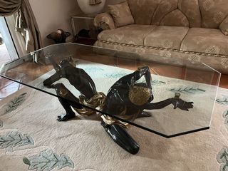 Très belle table basse de salon formée de deux esclaves agenouillés en bois laqué deux ors plateau de verre quadrangulaire à pans coupés H 48 L159 P80