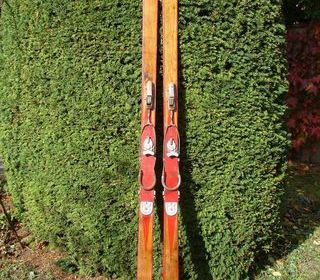 Anciens skis en bois - années 1950 Skis en bois avec semelle en bois et carres vissés fixations Ramy Made in France Longueur des skis : 214 cm En bon état A noter : des t