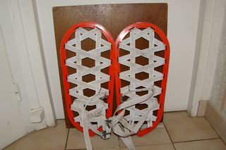 Raquettes à neige vintage Raquettes à neige de forme " pattes d'ours " avec cadre métallique orange et sangles. Longueur : 47,7 cm Largeur (au plus large) : 20,5 cm
