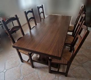 Cause déménagement, vends ensemble table, chaises et buffet de salle à manger en très bon état Fabrication tous piétements en orme massif Buffet : 4 portes et 2 tiroirs, 1 étagèr