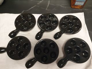 6 poêlons à escargots, vu leur âge (les années 80) ils sont en très bon état. En céramique émaillée noir brillant - diamètre 12,5cm longueur avec la poignée 19cm