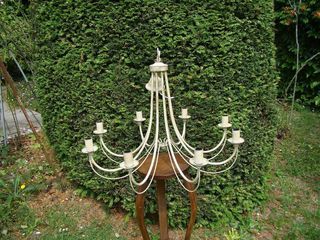 Lustre en acier à 8 branches couleur : crème avec effet vieilli bronze Diamètre : 73 cm Hauteur maximale : 72,5 cm en bon état A venir chercher sur place Règlement