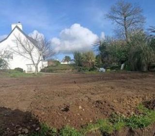 Finistère. Vends beau terrain constructible à très faible pente et paysagé de 1975 m2, bordé d'arbres d'ornement et fruitiers, pelouse, enrochement, point d'eau), viabilisé (raccor