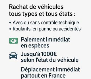Professionnel de l'automobile Rachat de véhicules tous types et tous états : €¢ Avec ou sans contrôle technique €¢ Roulants, en panne ou accidentes Paiement immédiat en espèces Jus