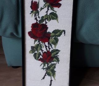 A VENDRE TAPISSERIE fait main sous verre TRES BON ETAT " Les Roses " Cadre noir largeur 18,5 X hauteur 48 cm A PRENDRE ET PAYER SUR PLACE