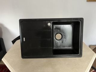 Evier en matériau composite noir avec vidange mais sans le robinet. Trou pour robinetterie fait pour égouttoir sur la gauche - voir photos