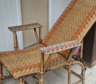 chaise longue en rotin années 1930 environ - avec repose pieds amovible, dossier relevable avec plusieurs positions - EXCELLENT ETAT - vernie -